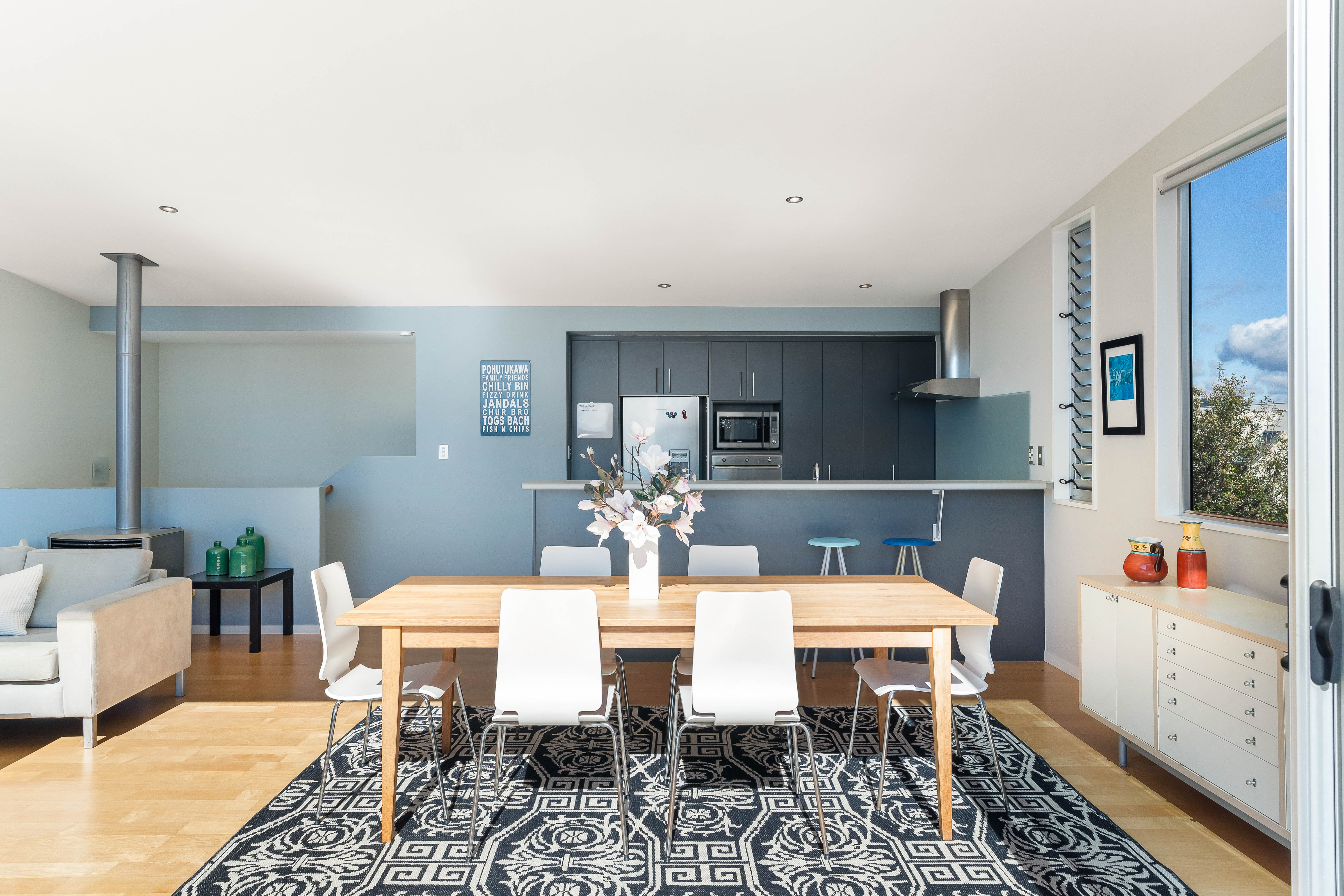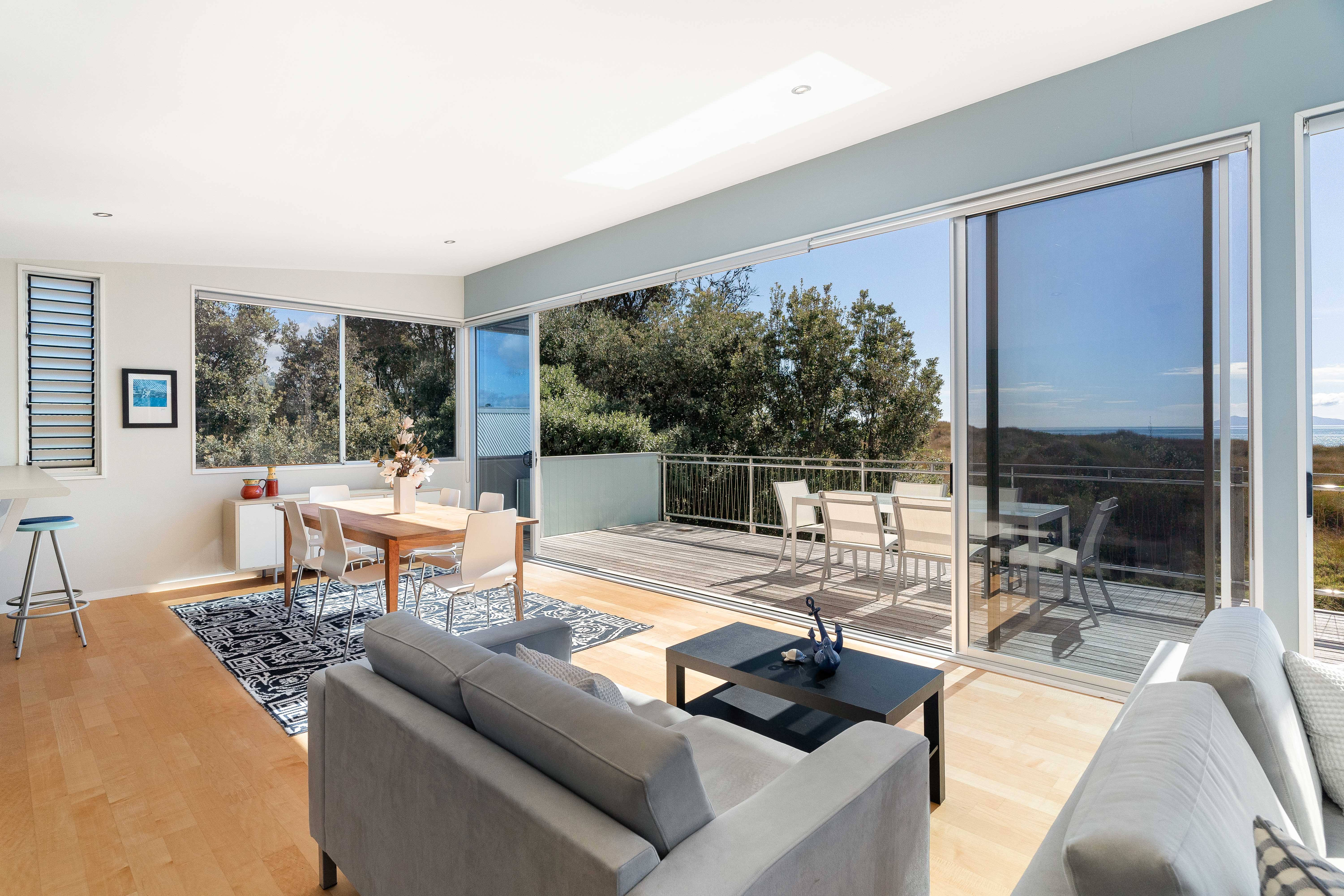 Floor to ceiling stacker doors frame the view and open onto the extensive decking, perfect for entertaining. Cosy up to the gas fire for chilly nights. External stairs down to the low maintenance garden, beach access and outside shower. 3 bedrooms, master with office nook, a private area to escape and read a book and bifold doors that lead onto the lower level deck.