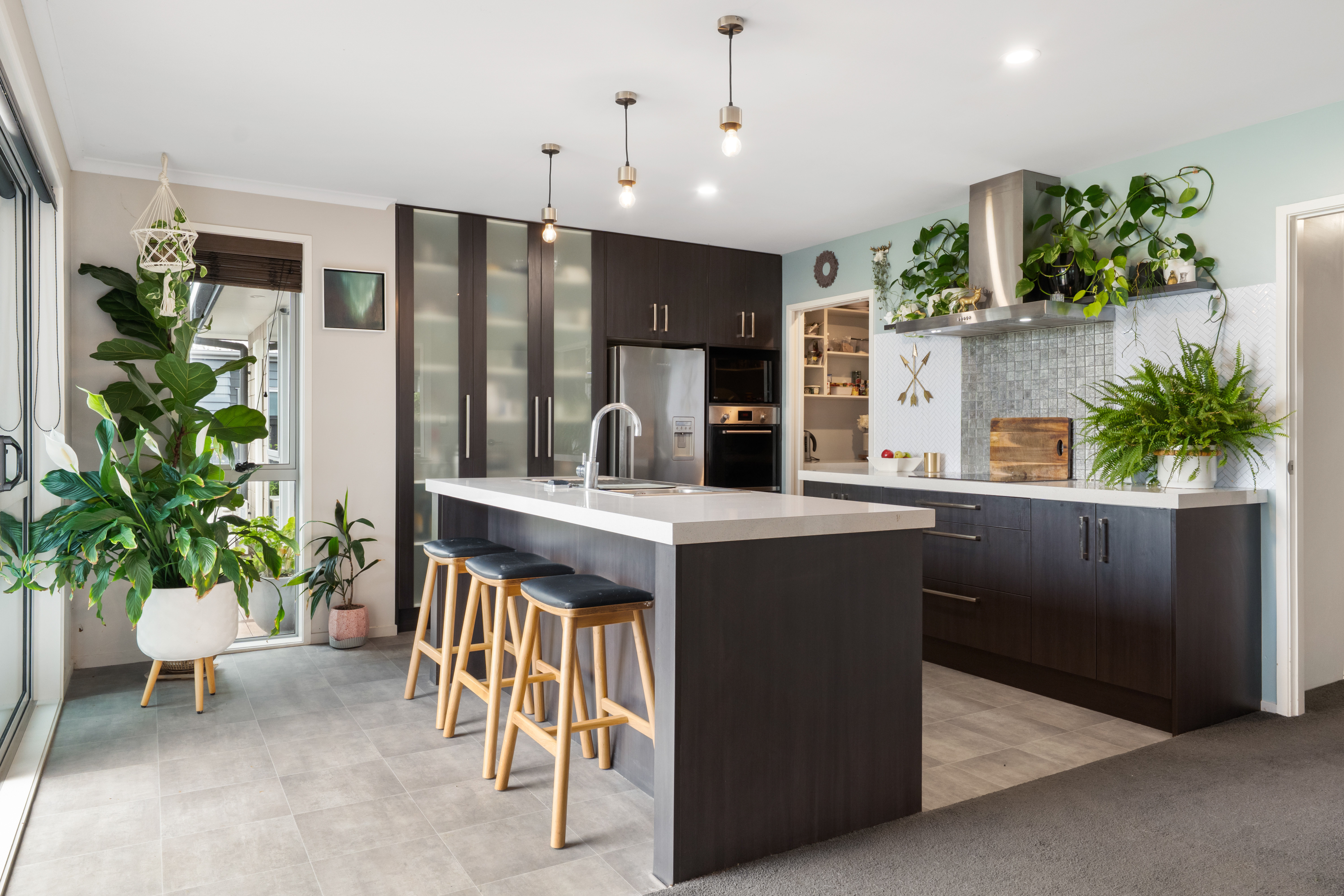 The expansive open-plan living area serves as the social hub, centered around a sleek designer kitchen. With a generous island bench for casual dining and a discreet scullery equipped with modern appliances, entertaining is effortless. Throughout the home, thoughtful storage solutions ensure a clutter-free environment.
