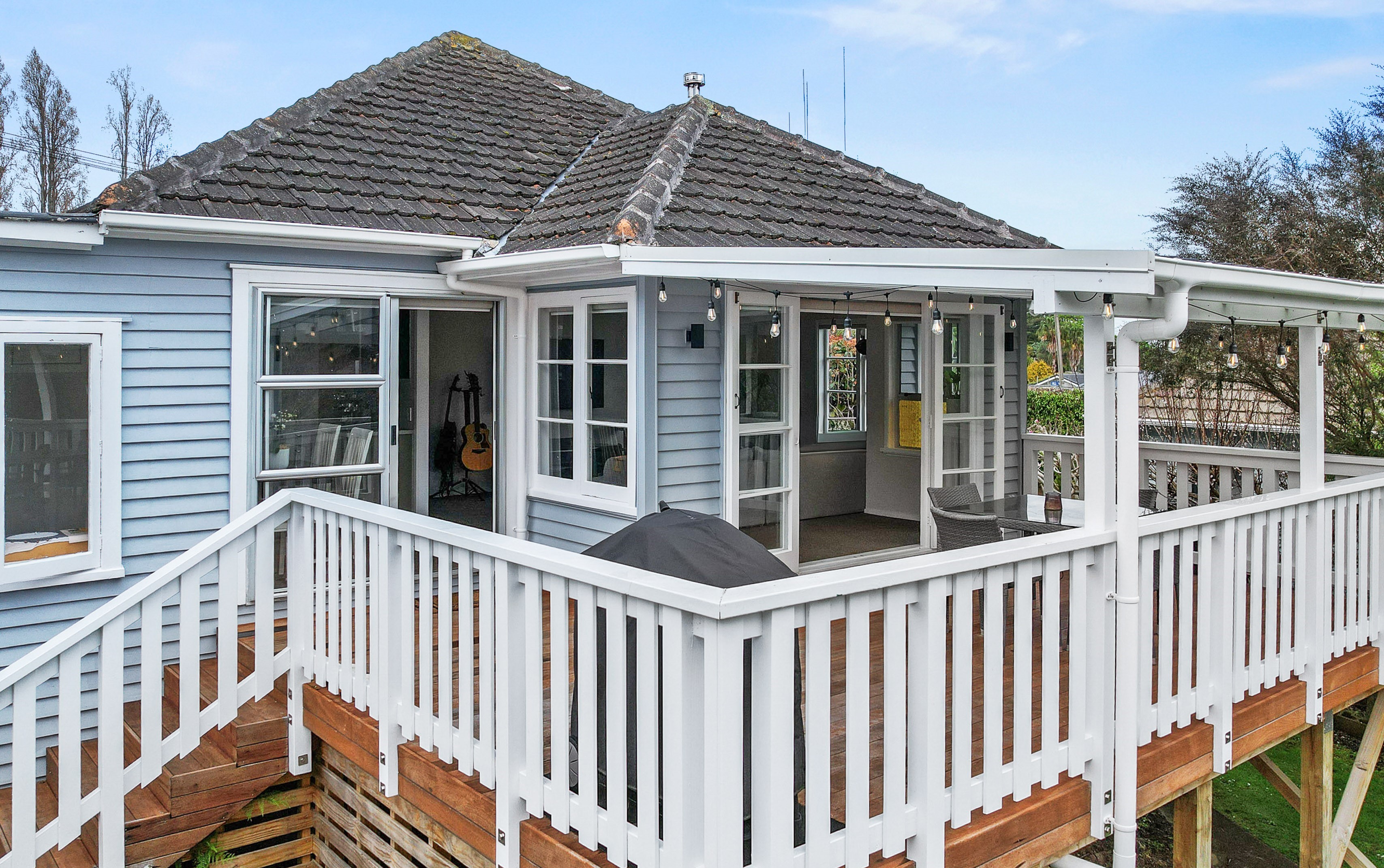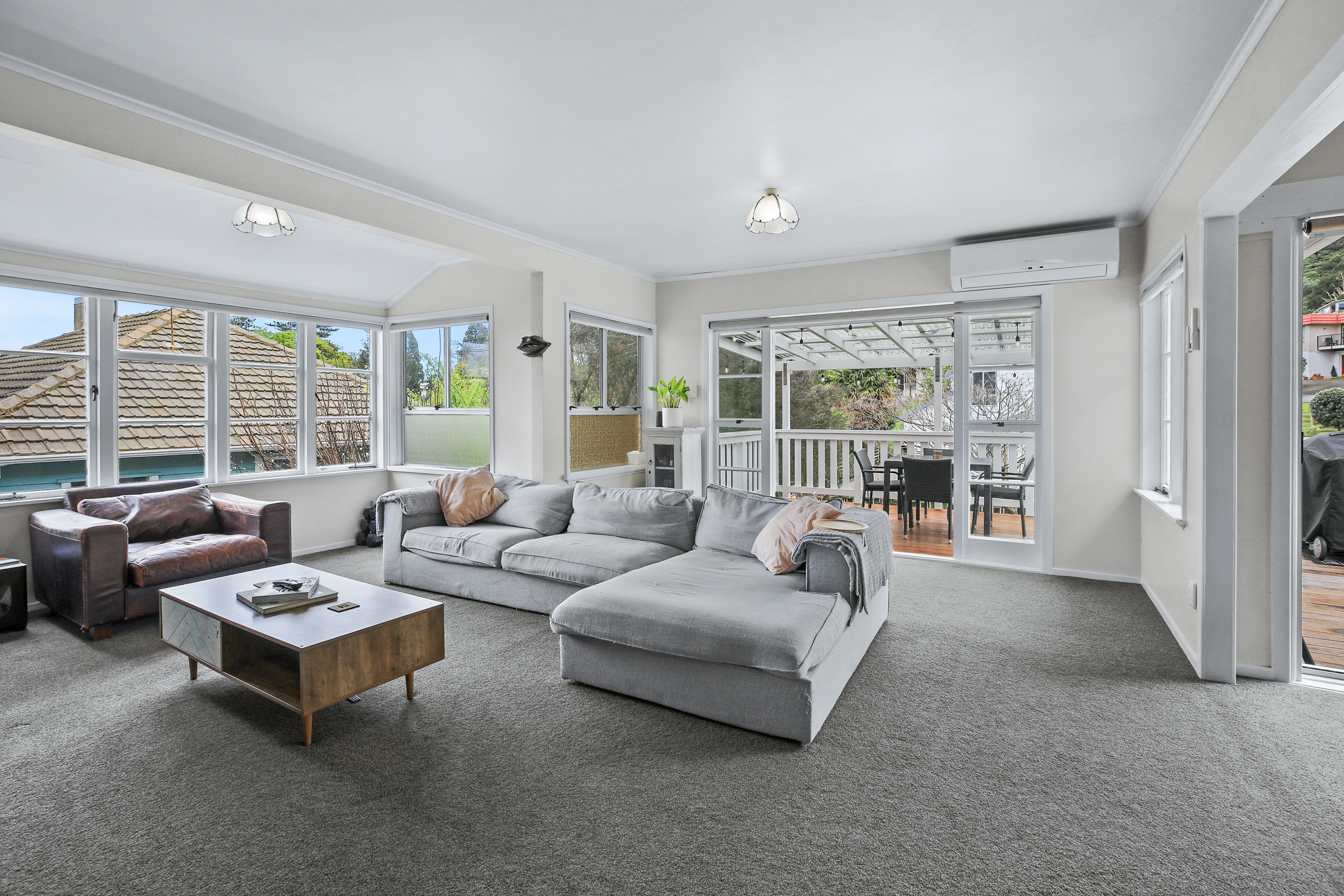 • Large living area with a wood burner and heat pump, which flows onto an entertaining deck.