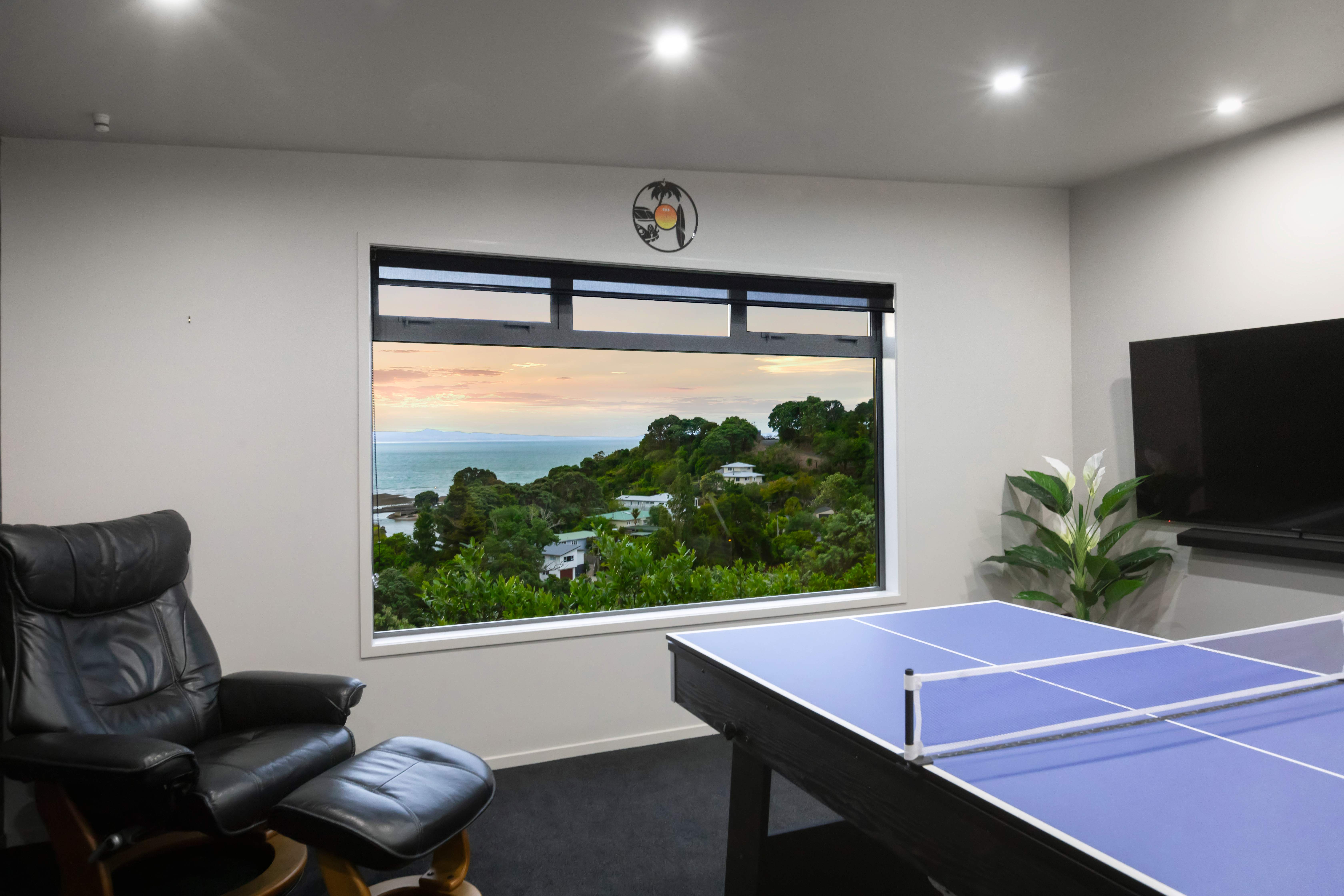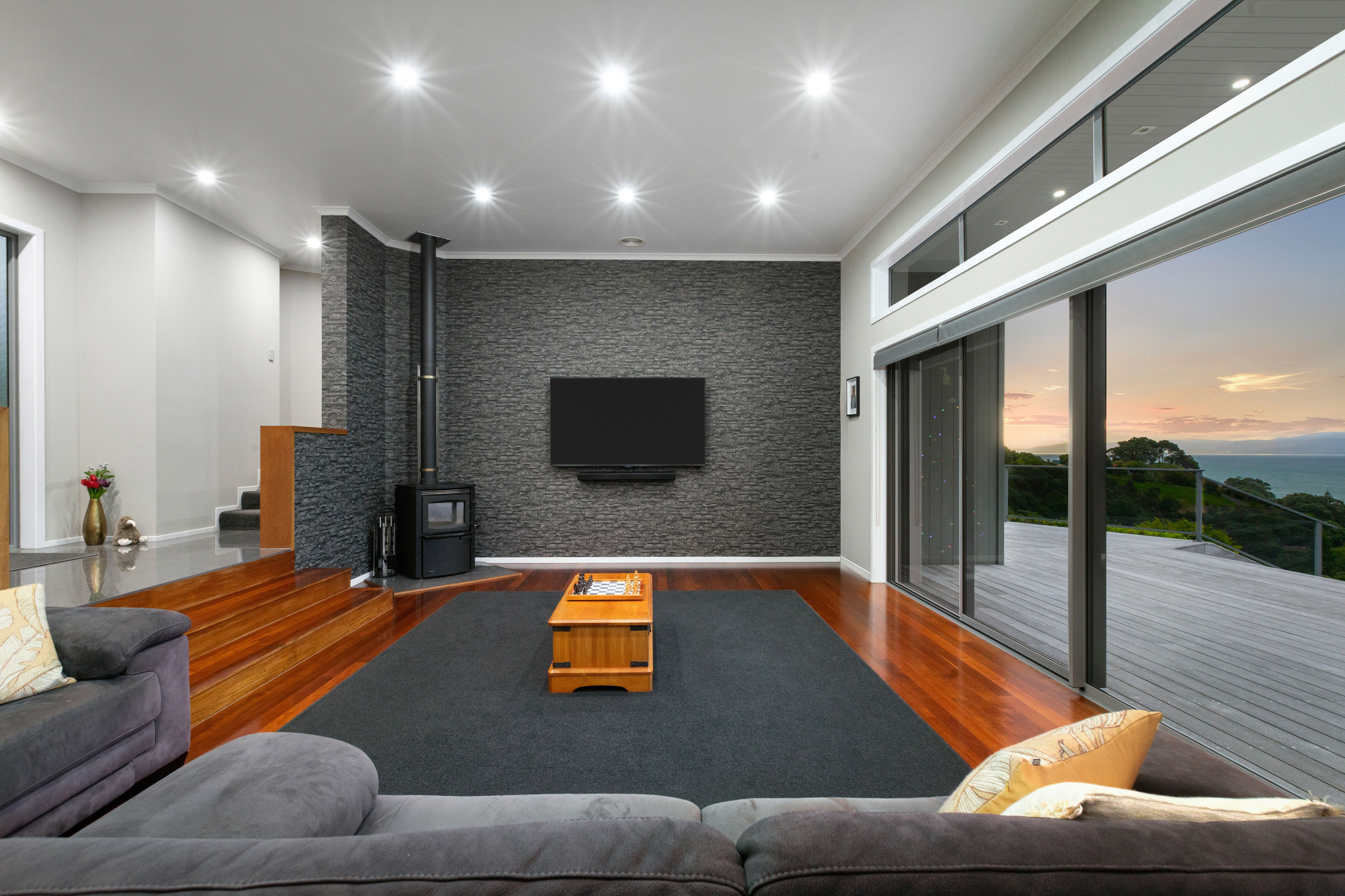 Open-plan lounge and dining area, with fantastic sea views through tinted glass, or relax on the Kwila decking.