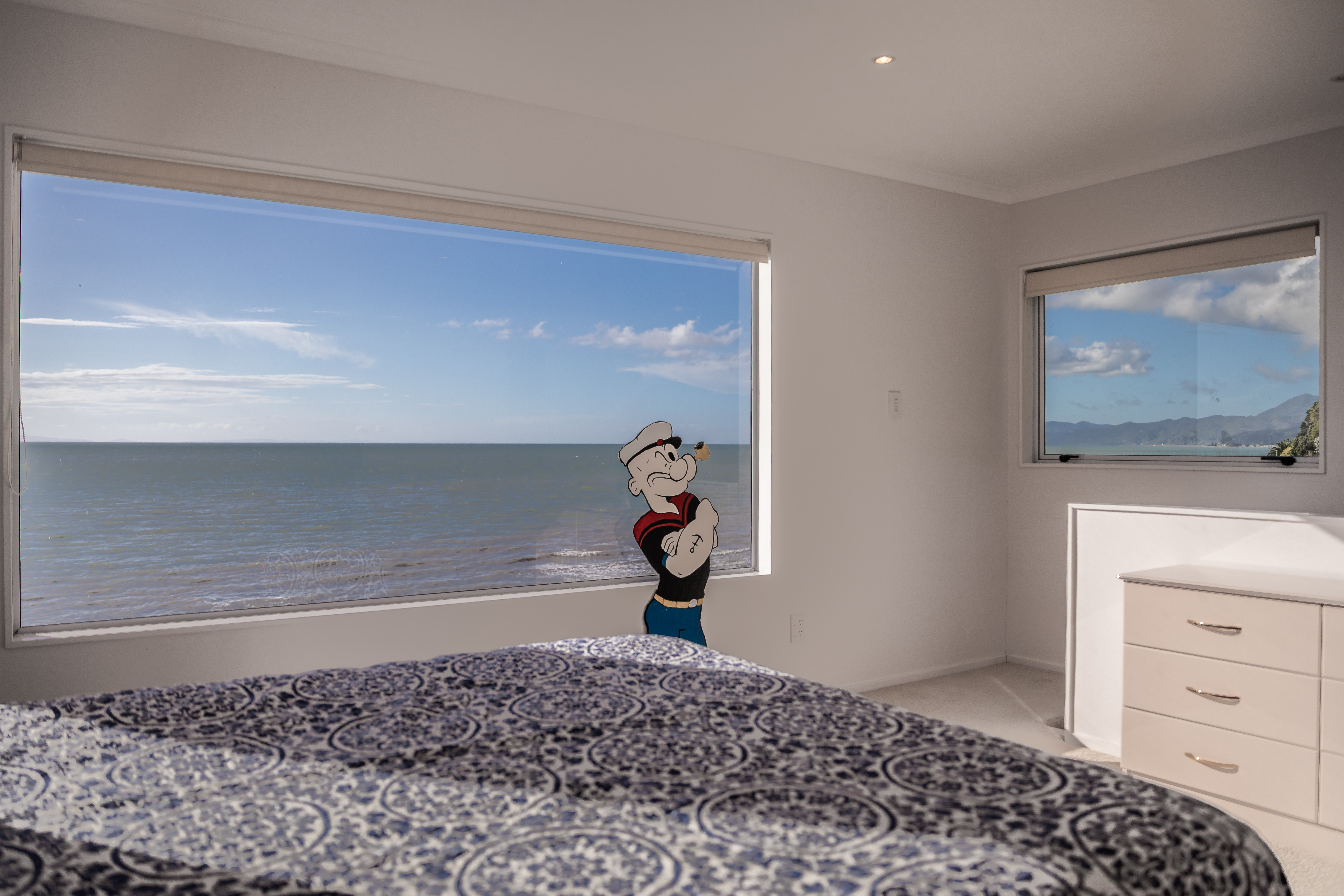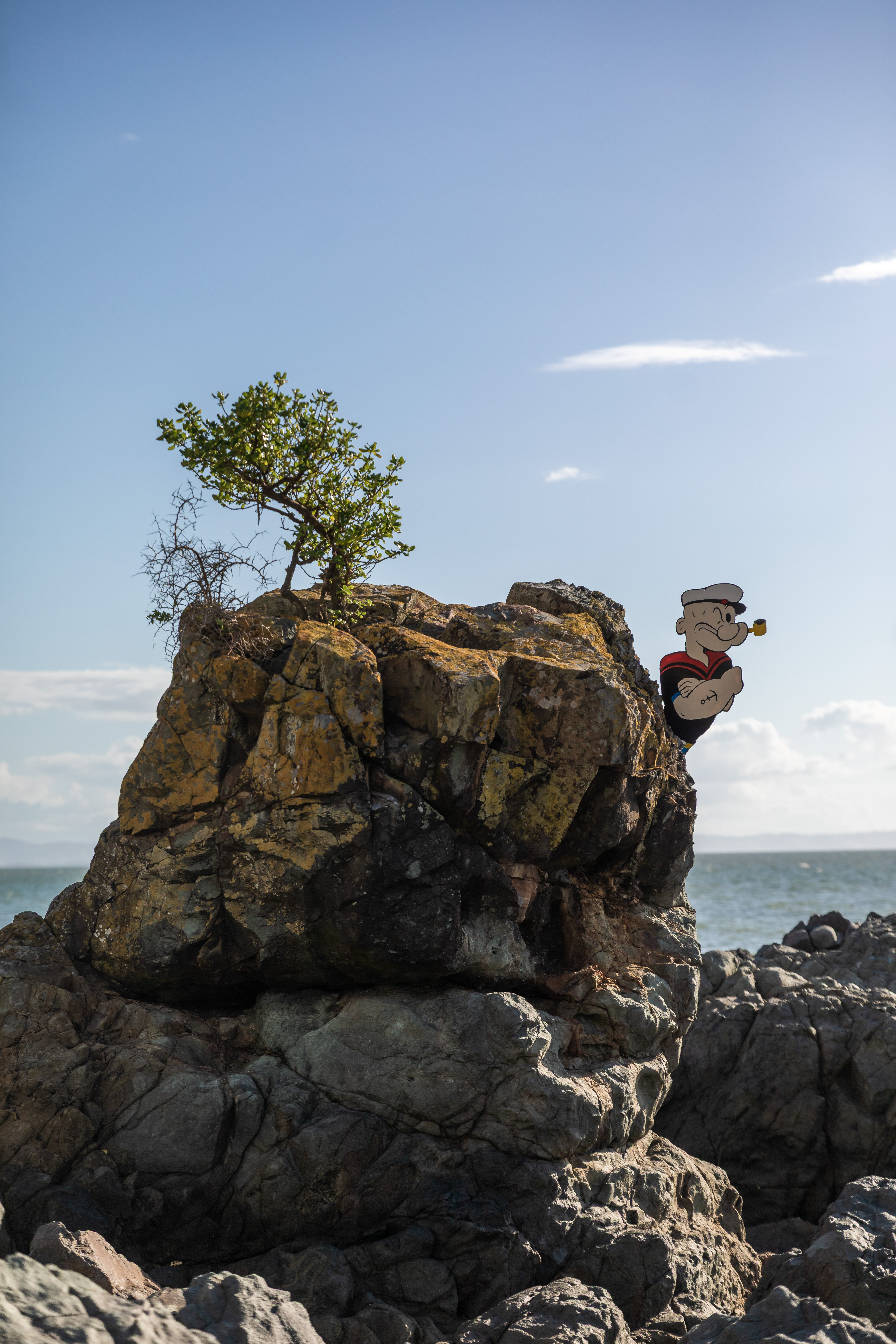Once upon a time, there was a strong and funny sailor named Popeye Pete. He had one squinty eye, big muscles, and a pipe that made funny noises when he talked. Popeye Pete loved sailing the seas and helping anyone in trouble. One day, after many adventures across the oceans, he sailed to the beautiful Coromandel Coast. There he found a cosy spot at 144 Thames Coast Road, Whakatete Bay, where he and his best friend Olive May would stay between voyages.