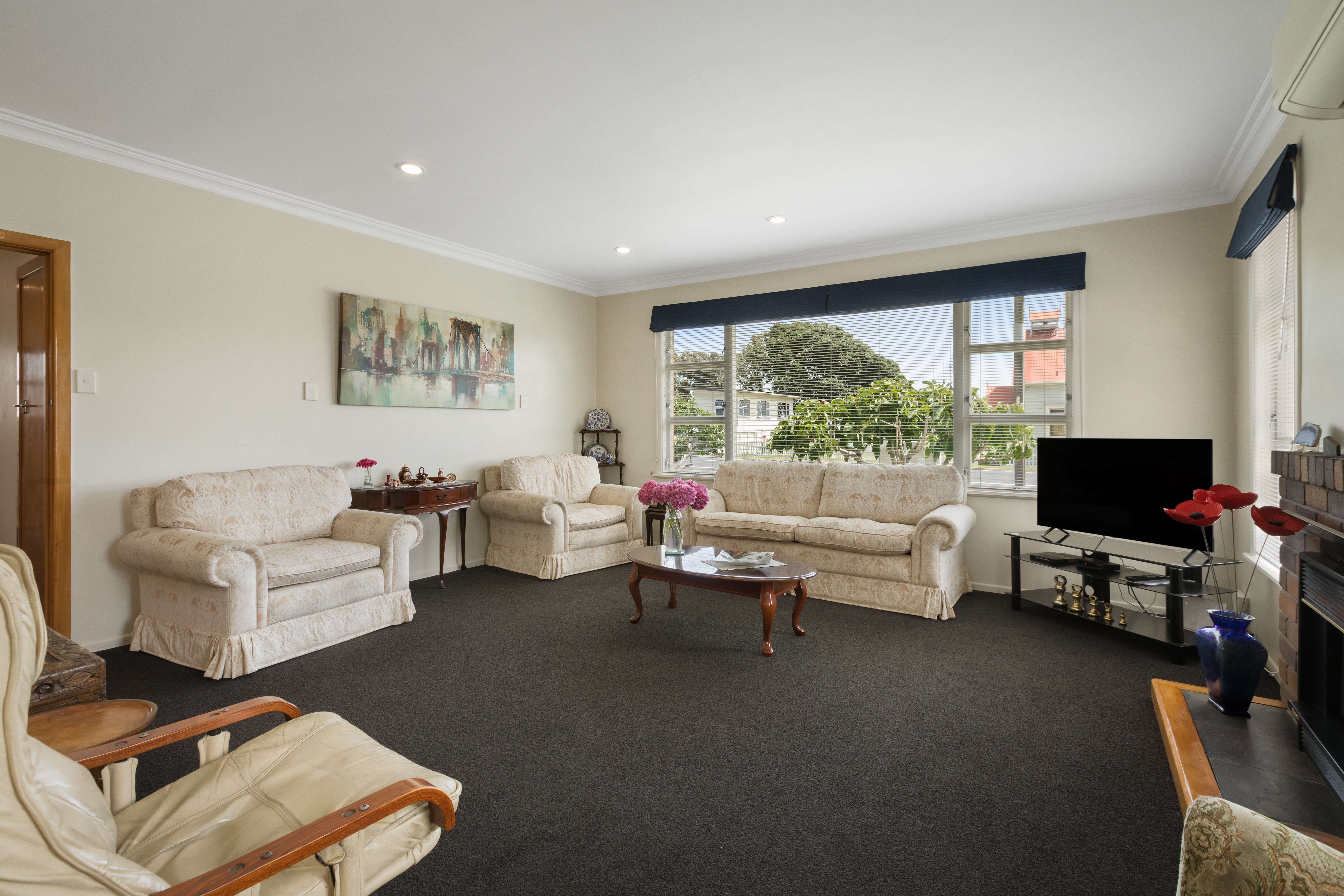 The layout has everyday living in mind, offering a natural flow between the living, kitchen, and dining spaces. The modern kitchen is equipped with high-quality appliances and enough workspace for your culinary adventures. The living space is ample for the family, with the added benefit of a cozy fire in the chilly months.