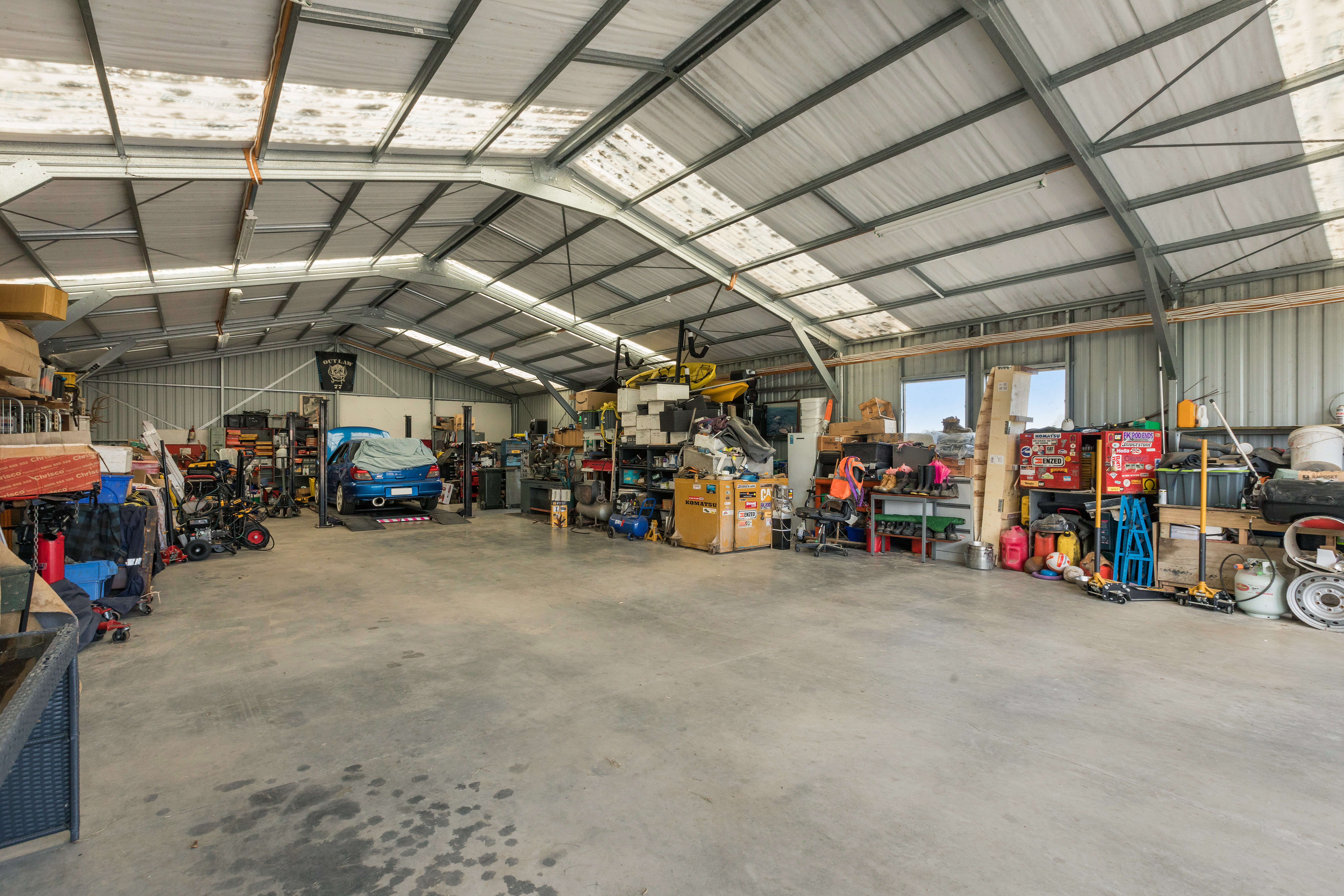 A 200m2 workshop/shed, steel frame, Coloursteel exterior, Clearlite roof, approx. 3m stud, power connected and two roller doors to enter. Big enough for a hoist, multiple cars and a boat!