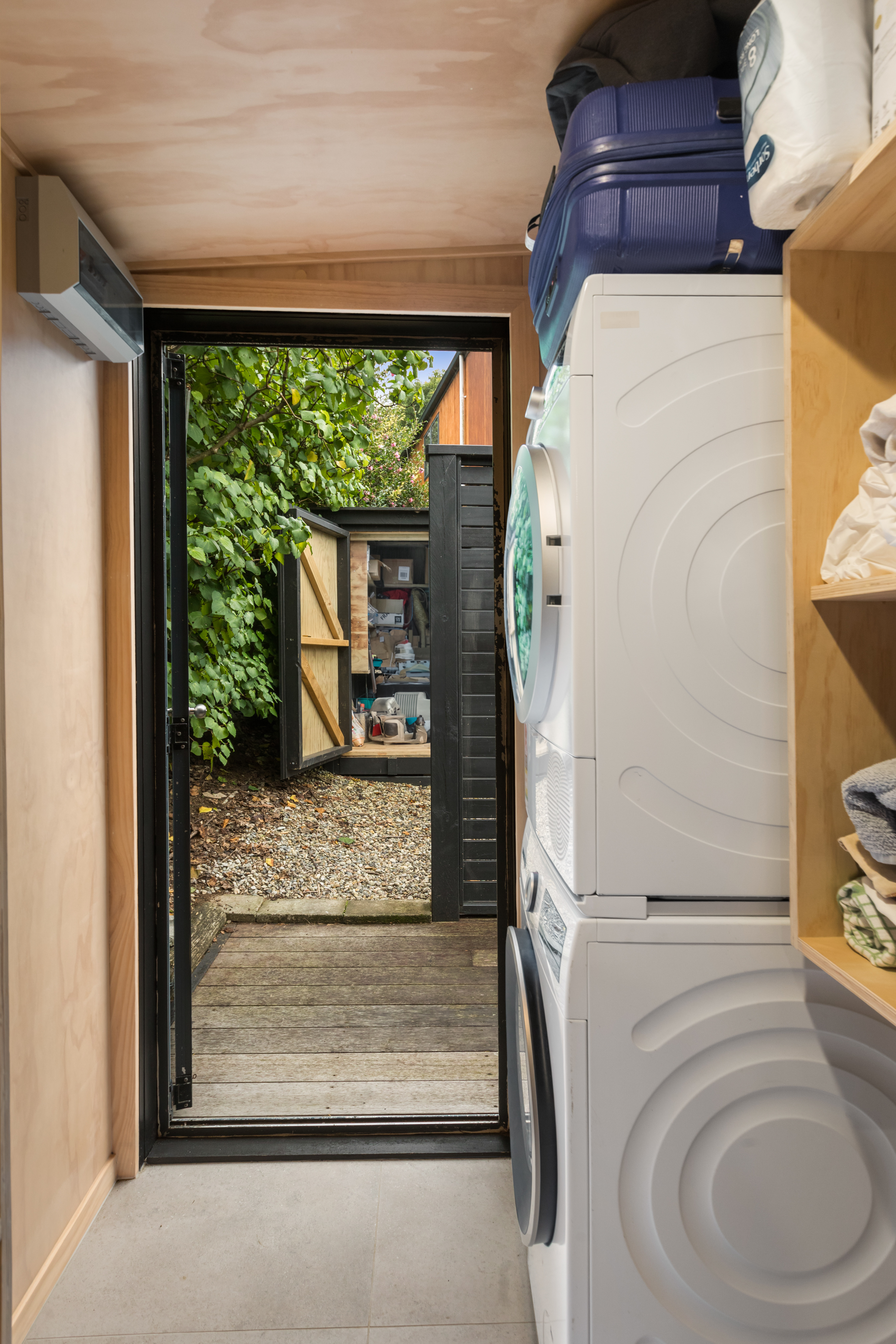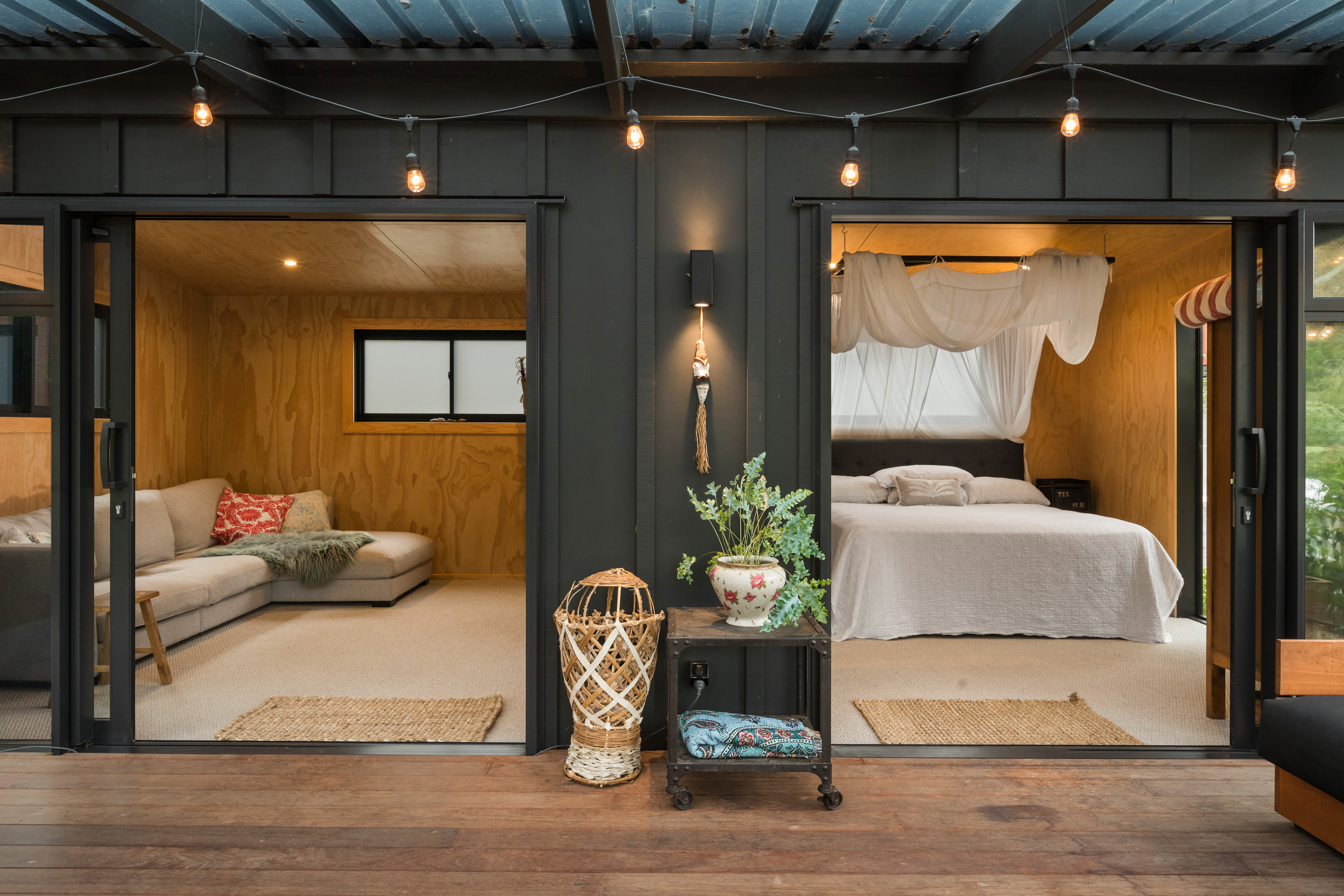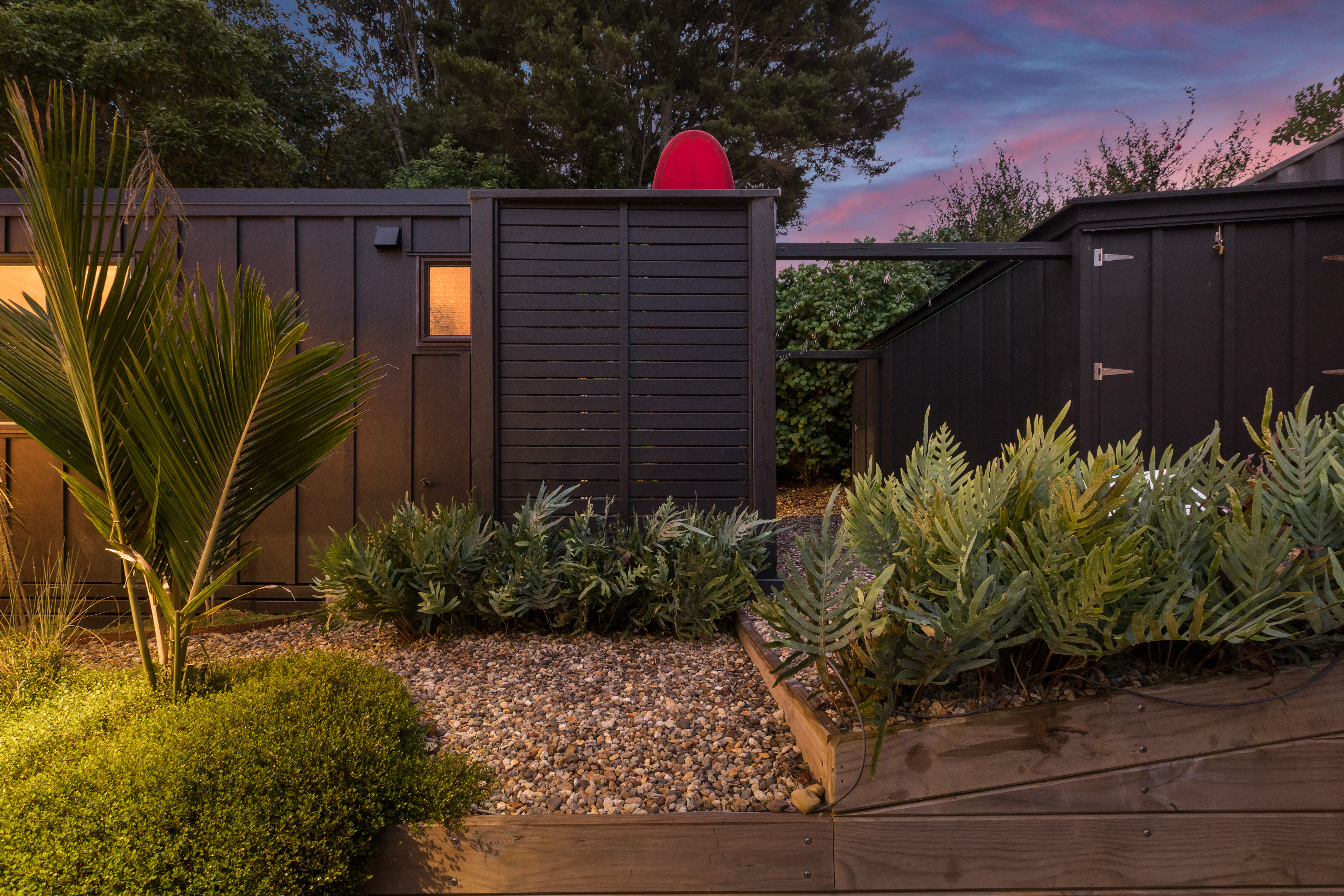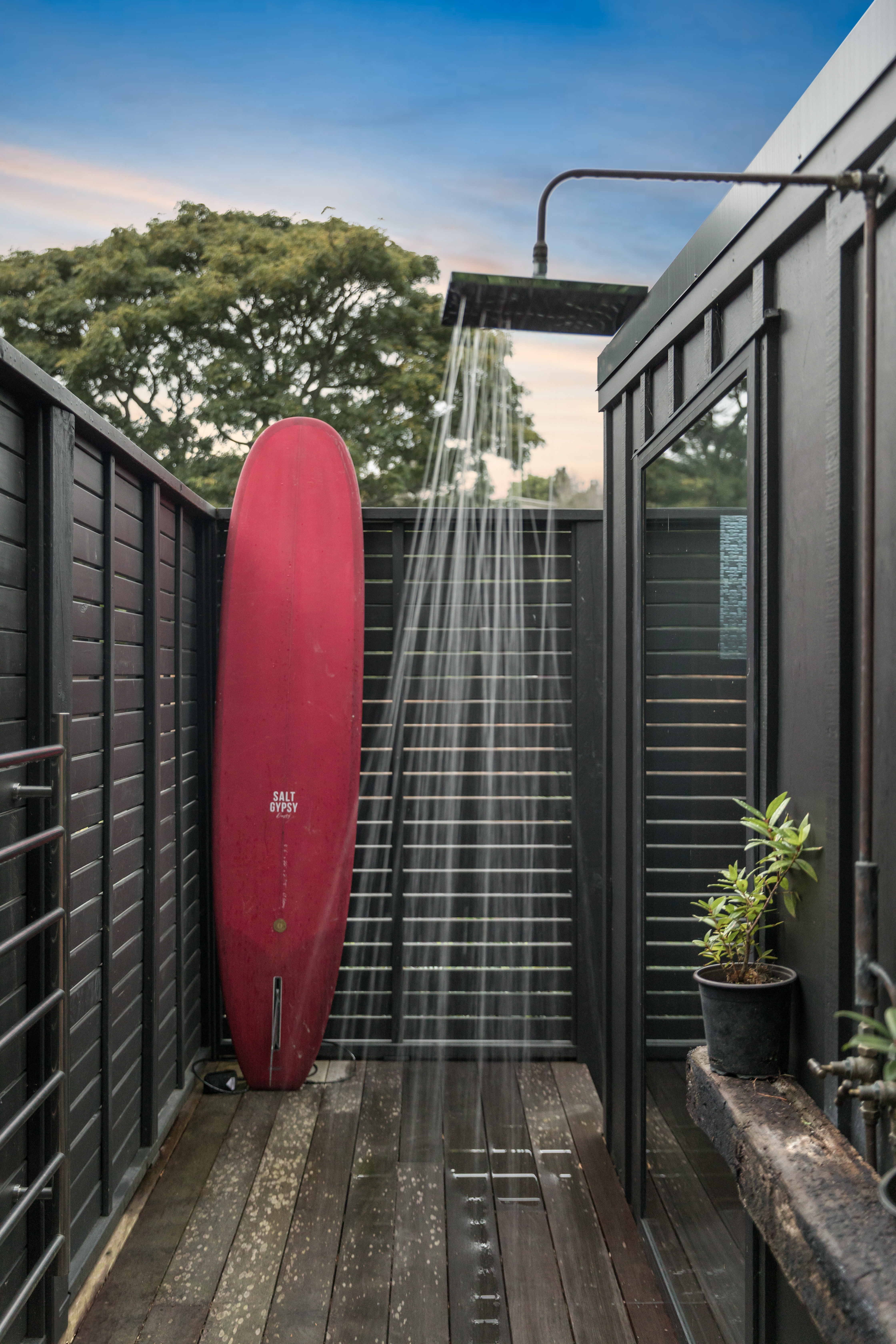 The second pod houses the kitchen, bathroom, and laundry, with the bonus of a private outdoor shower tucked away at the back-complete with hot and cold water. Just behind, a spacious storage shed offers plenty of room for surfboards, bikes, and all your beach essentials.