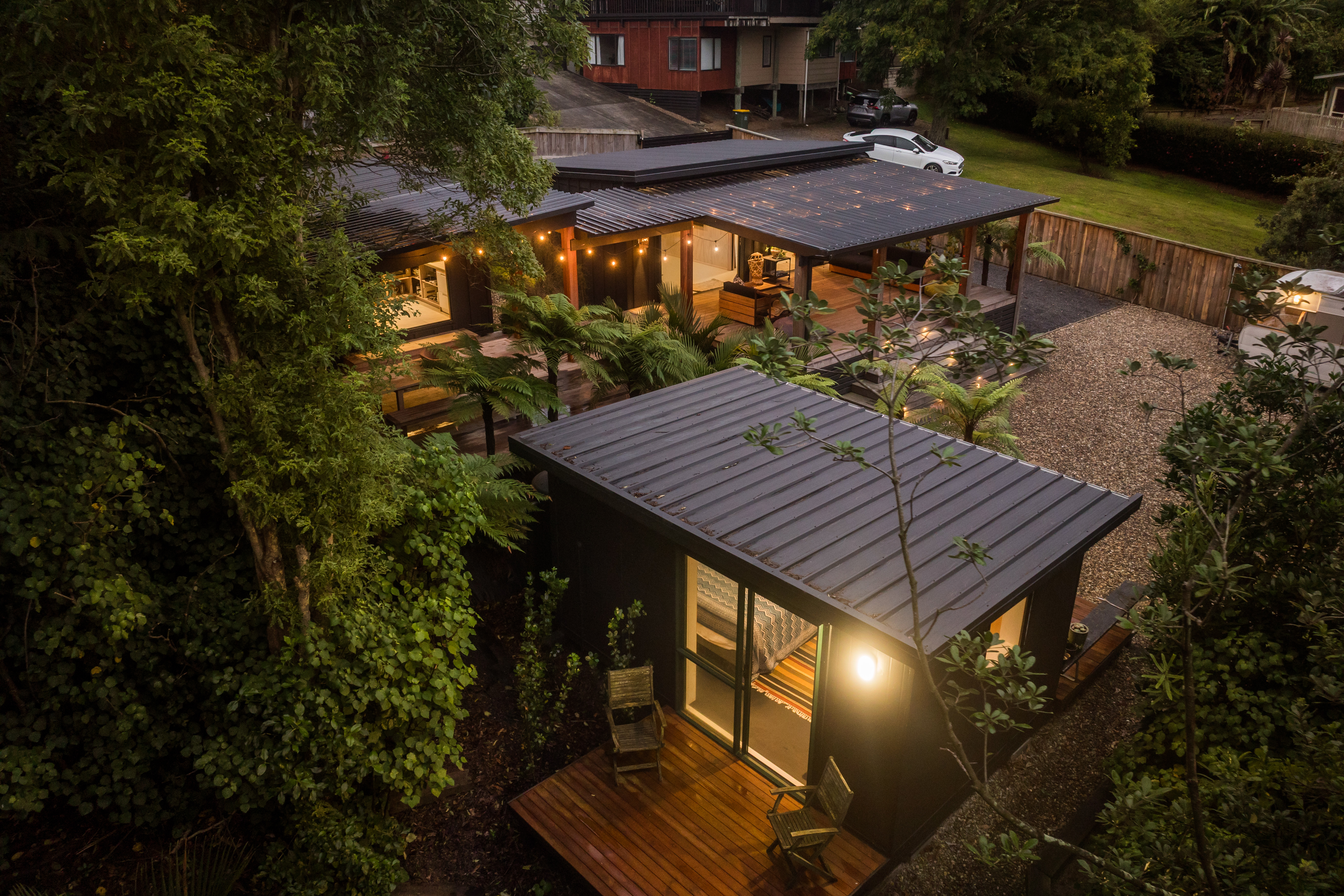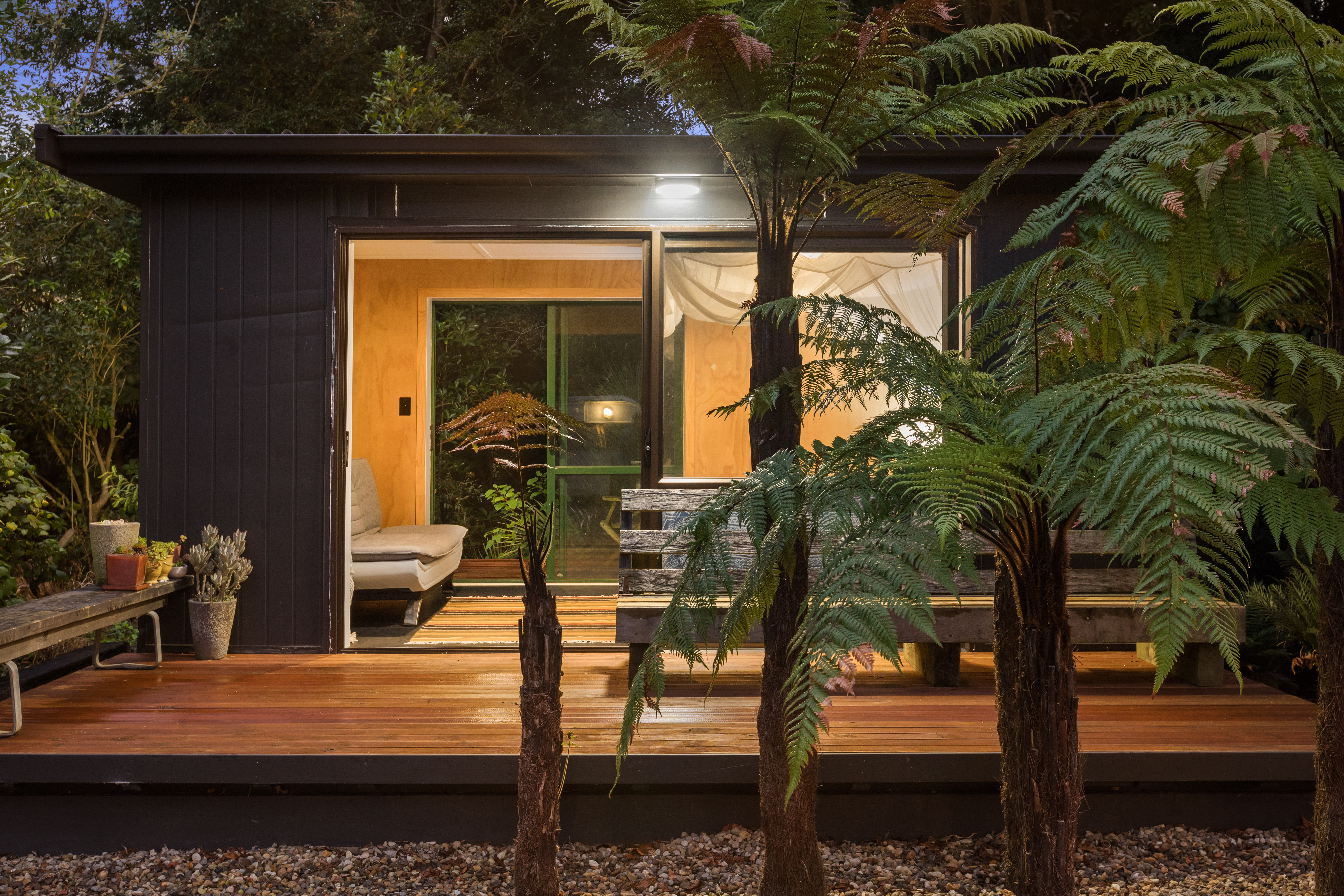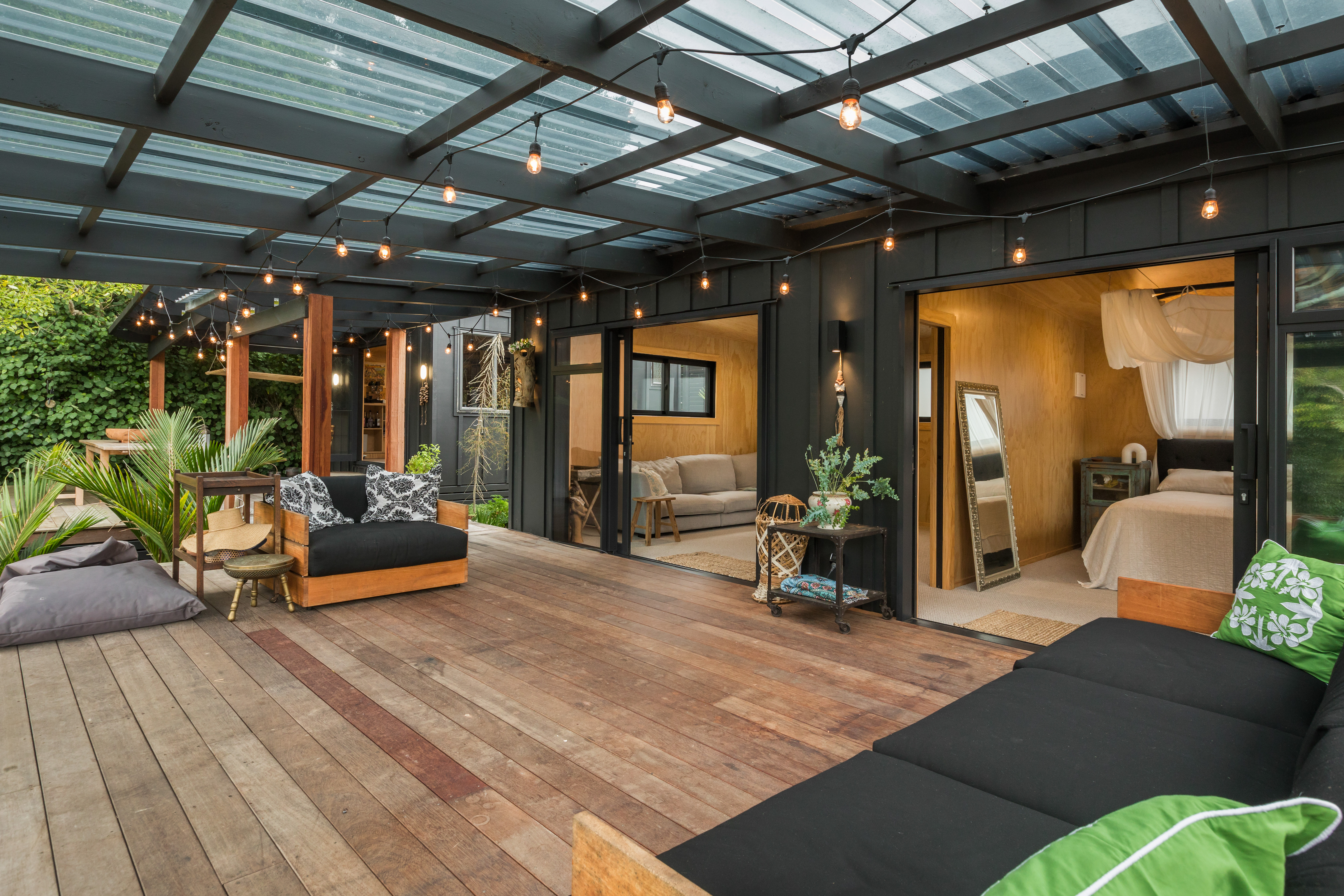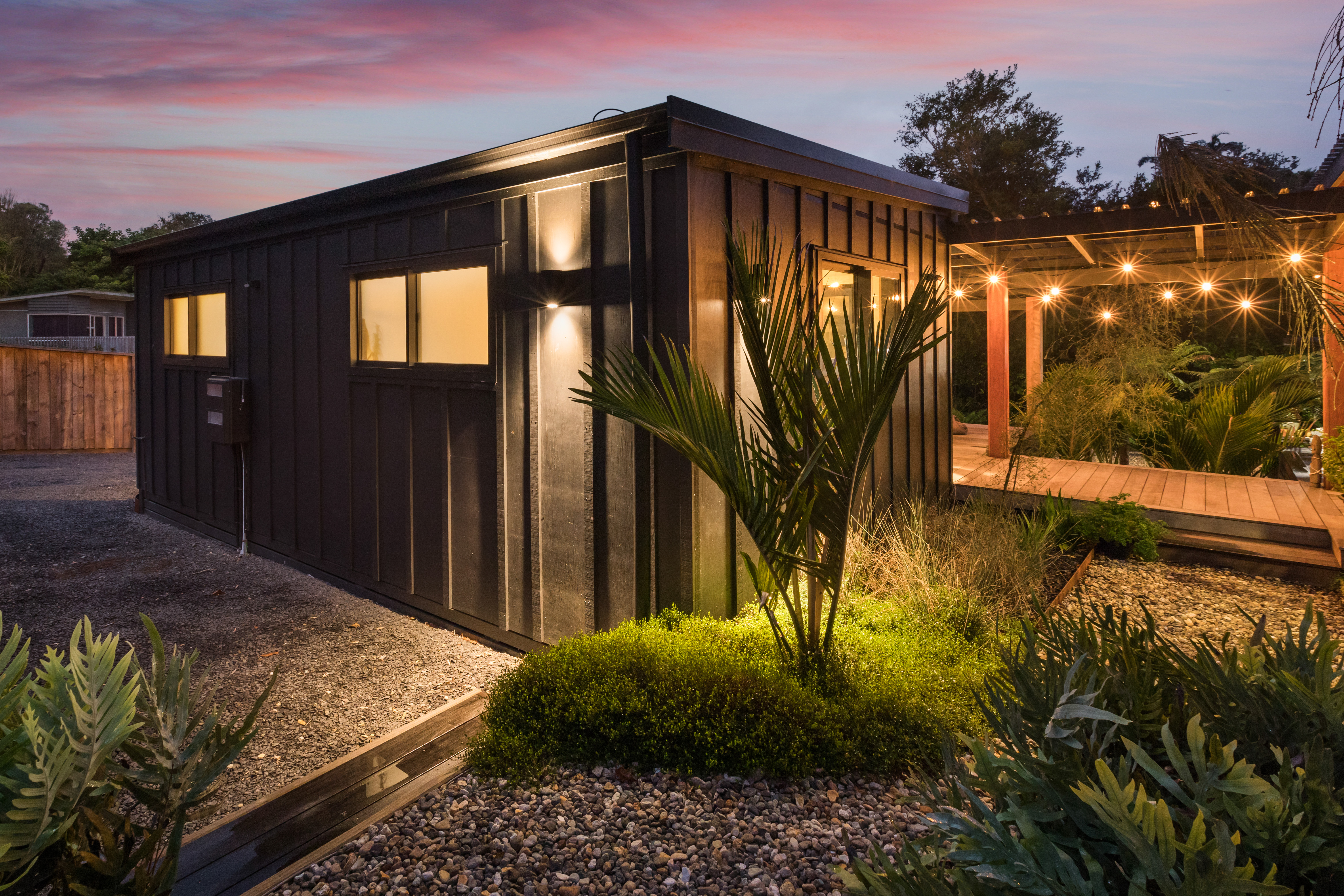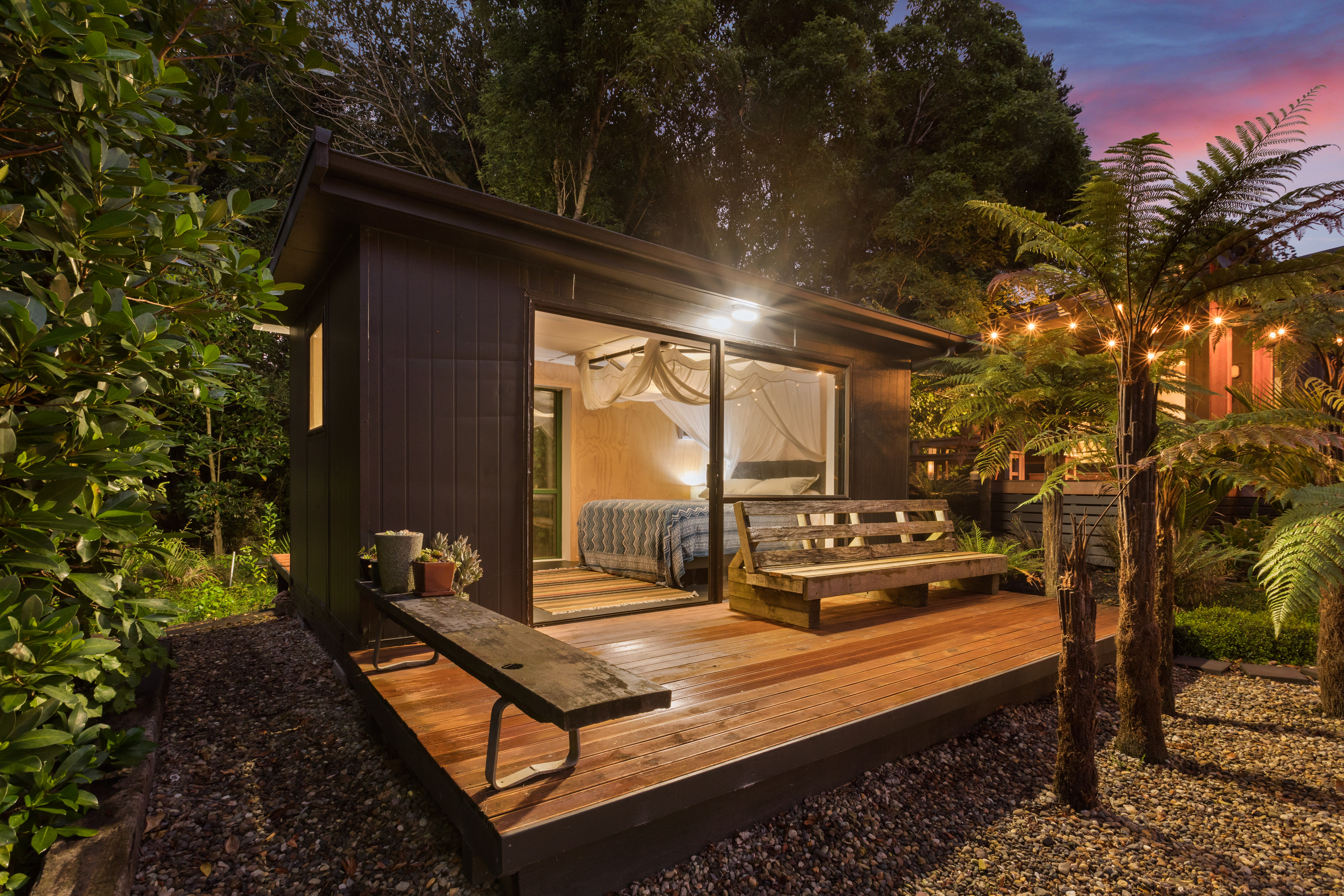 The second pod houses the kitchen, bathroom, and laundry, with the bonus of a private outdoor shower tucked away at the back-complete with hot and cold water. Just behind, a spacious storage shed offers plenty of room for surfboards, bikes, and all your beach essentials.