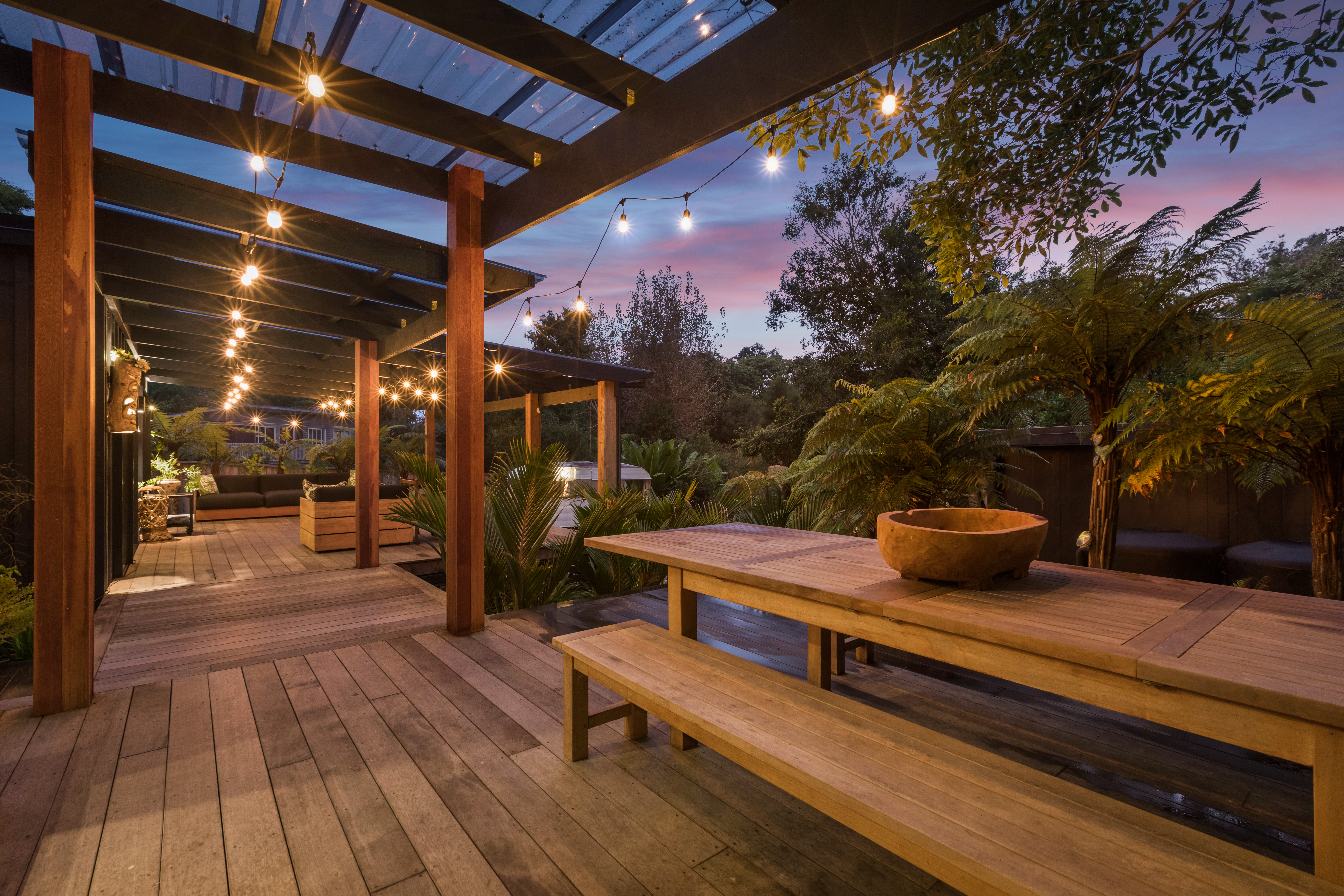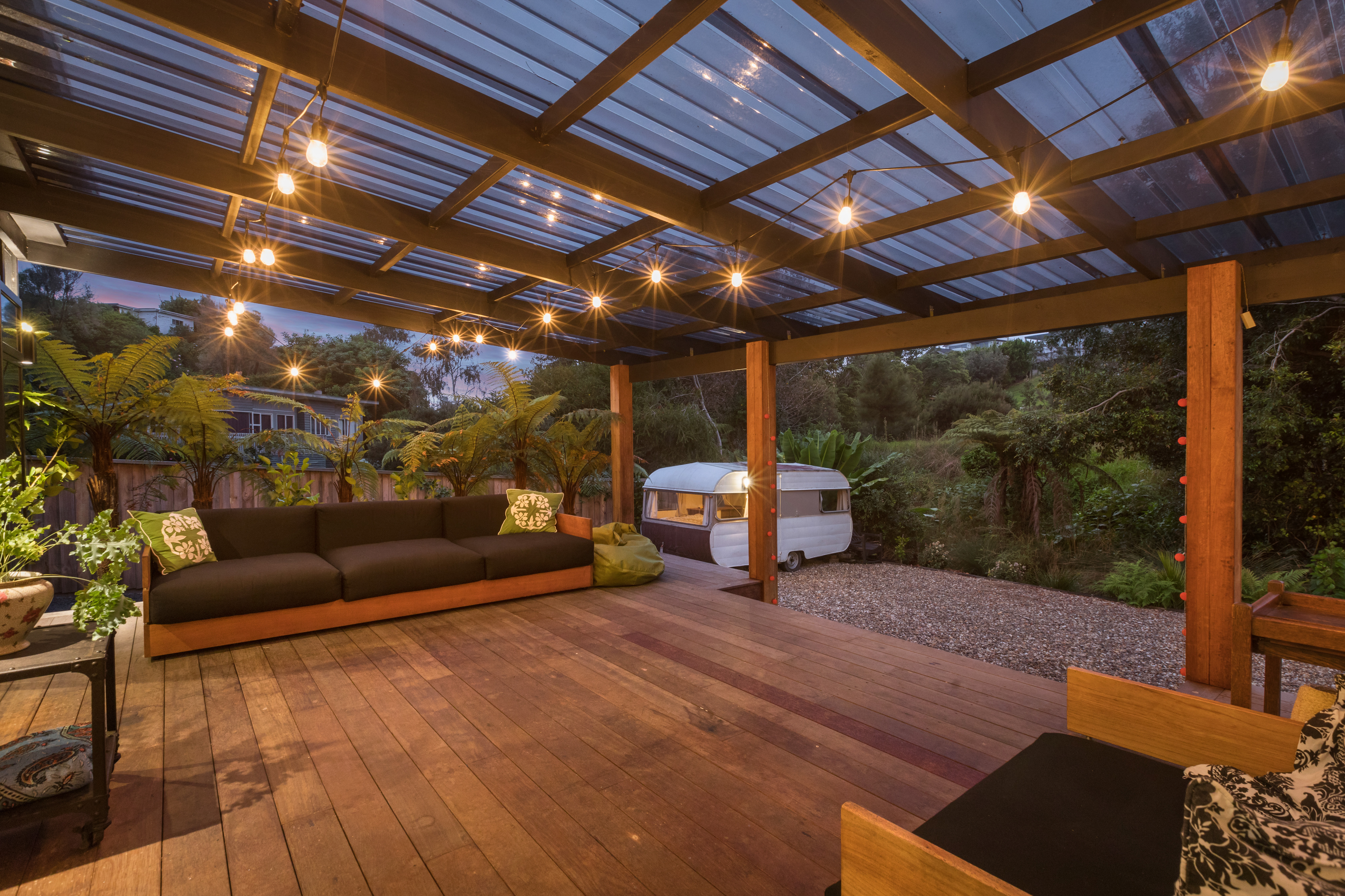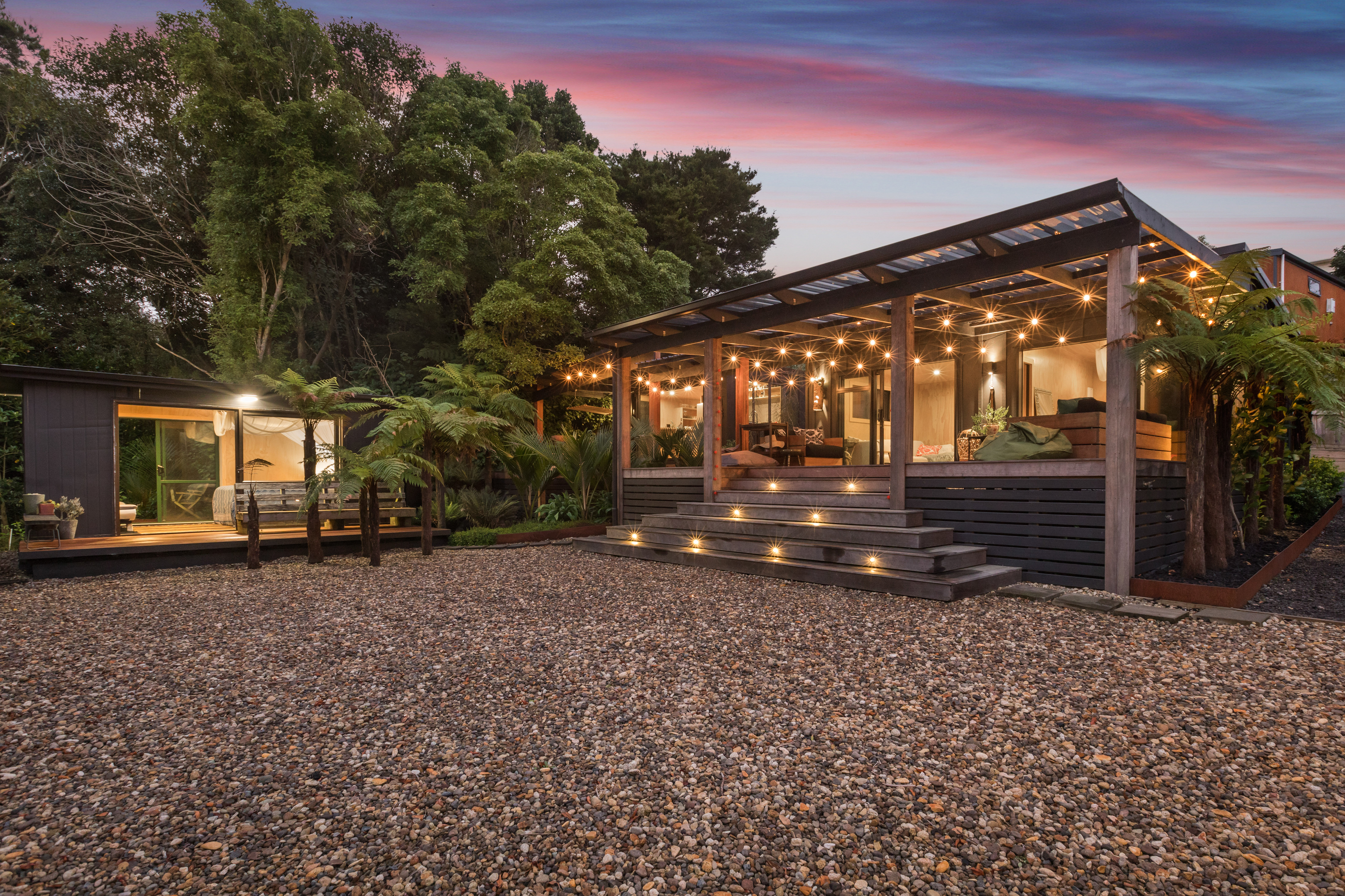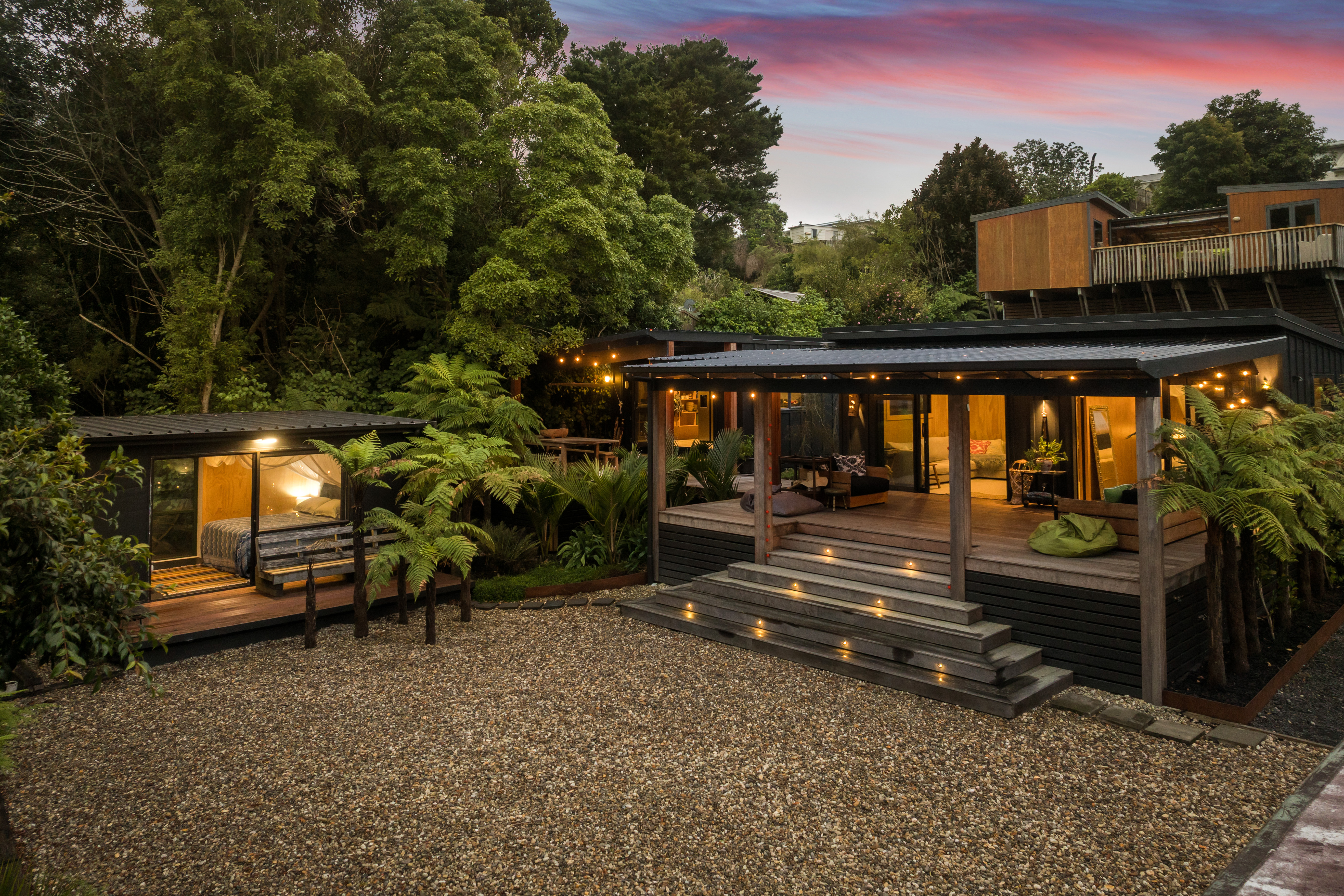 This property offers a layout unlike any other. In the first pod, you'll find a bedroom and living area that open onto a large, covered deck connecting the pods-perfect for relaxing, listening to native birds, and soaking in the lush green surroundings. It's quiet and peaceful, with the soothing sound of crashing waves in the background.