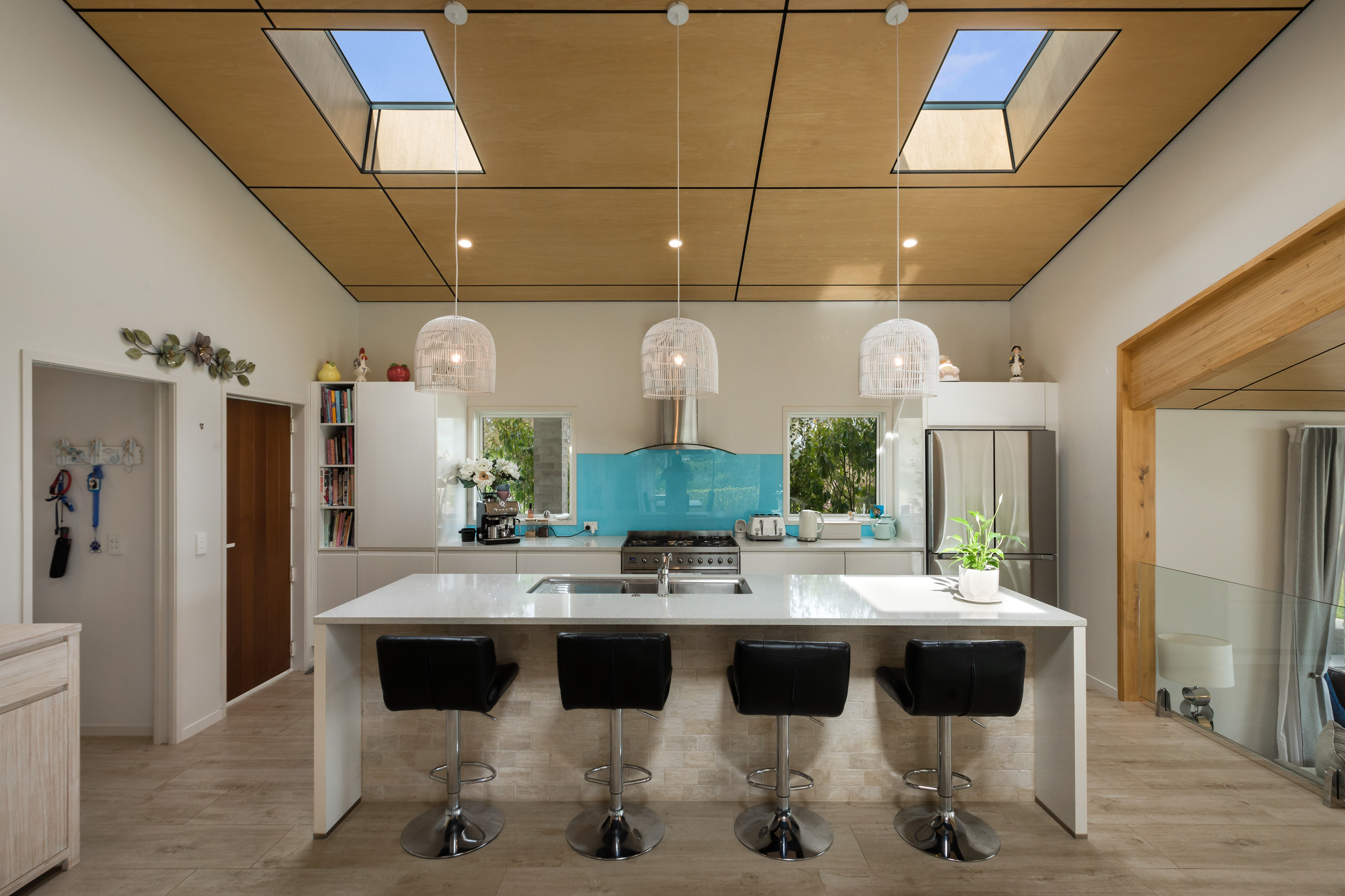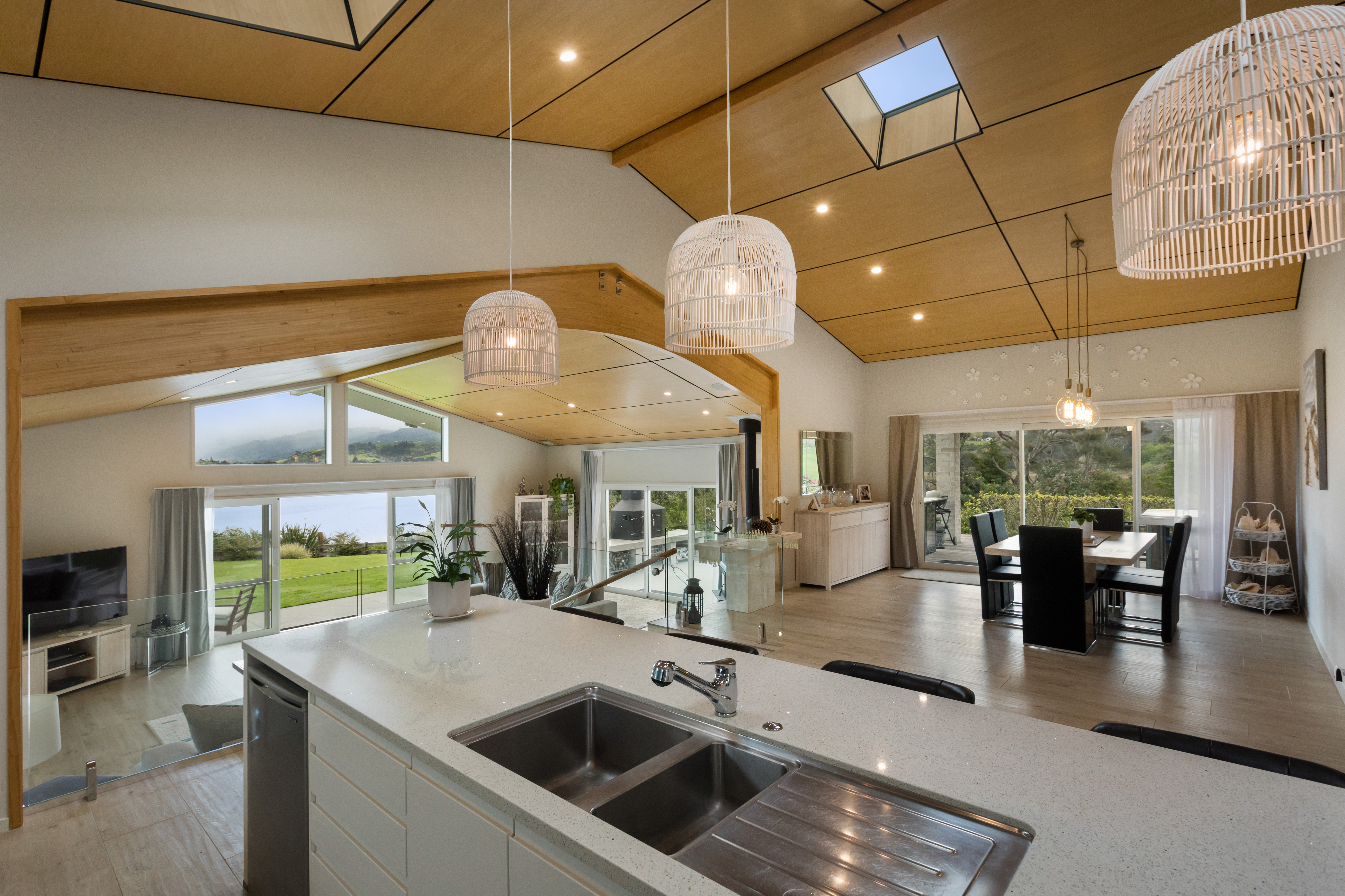 High stud ceilings create a wonderful sense of space, while the wood burner keeps the home warm and inviting through the cooler months.